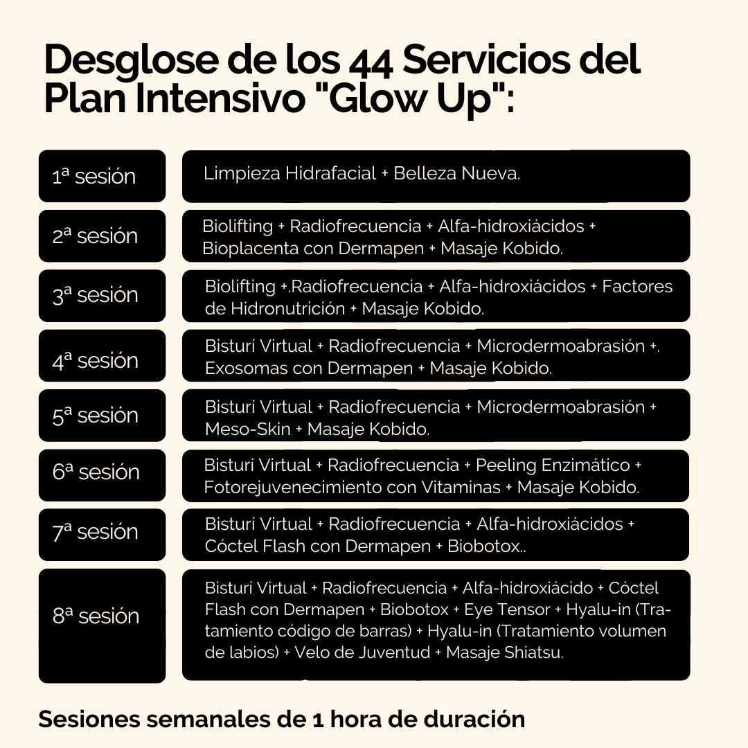 Efectos que experimentarás con el plan «Glow Up» a lo largo de sus 8 visitas: